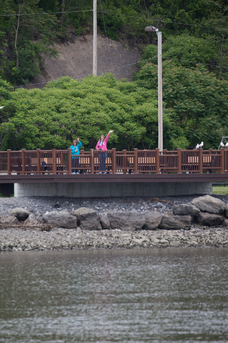 After a good night’s sleep, we started out early this morning towards our destination of Catskill, NY. While we were riding my niece, Cheryl, texted and asked me to let her know when we were near the Kingston Bridge because she wanted to go to a park nearby and wave at us as we passed. Soon my brother, Jack, called and said he and Jean would be out there to greet us too. We, of course, loved the idea. What a thrill it was to see them waving enthusiastically from shore! Even better, Cheryl brought out her camera to take pictures of us as we went by and Jack videoed us as well.
