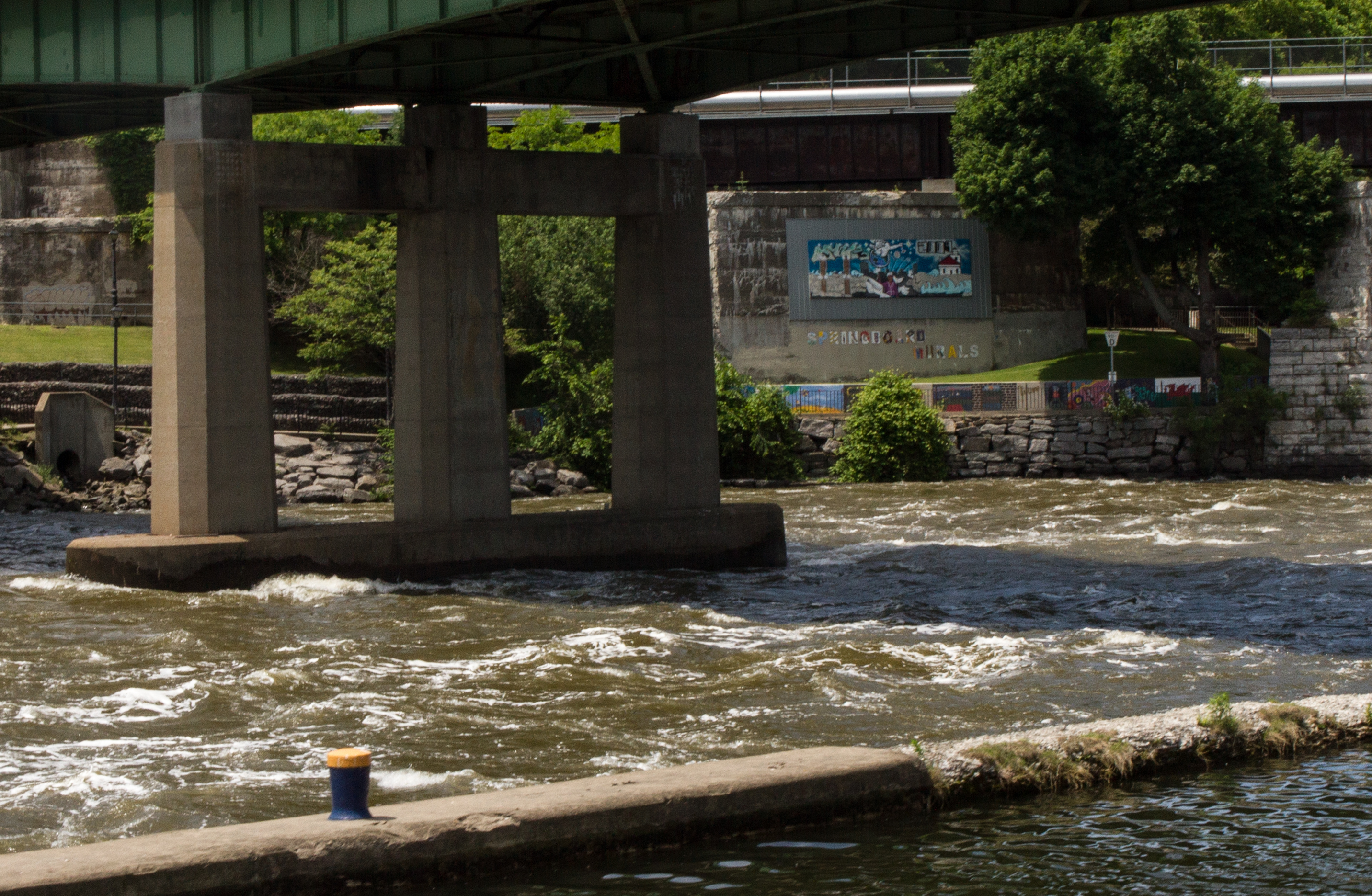 These images show the view from our dock just before Lock 8.  You can see how the canal waters are calm, but the river that flows next to the canal is very fast flowing.  Lock 8 lowers boats to the bottom of the river where both meet Lake Ontario.