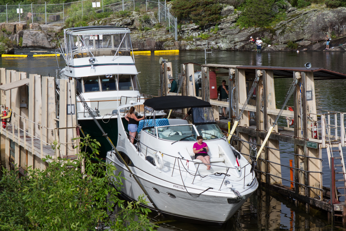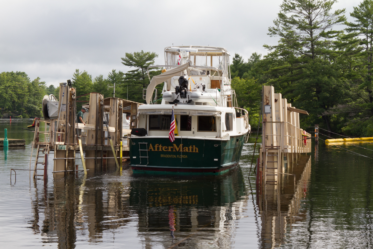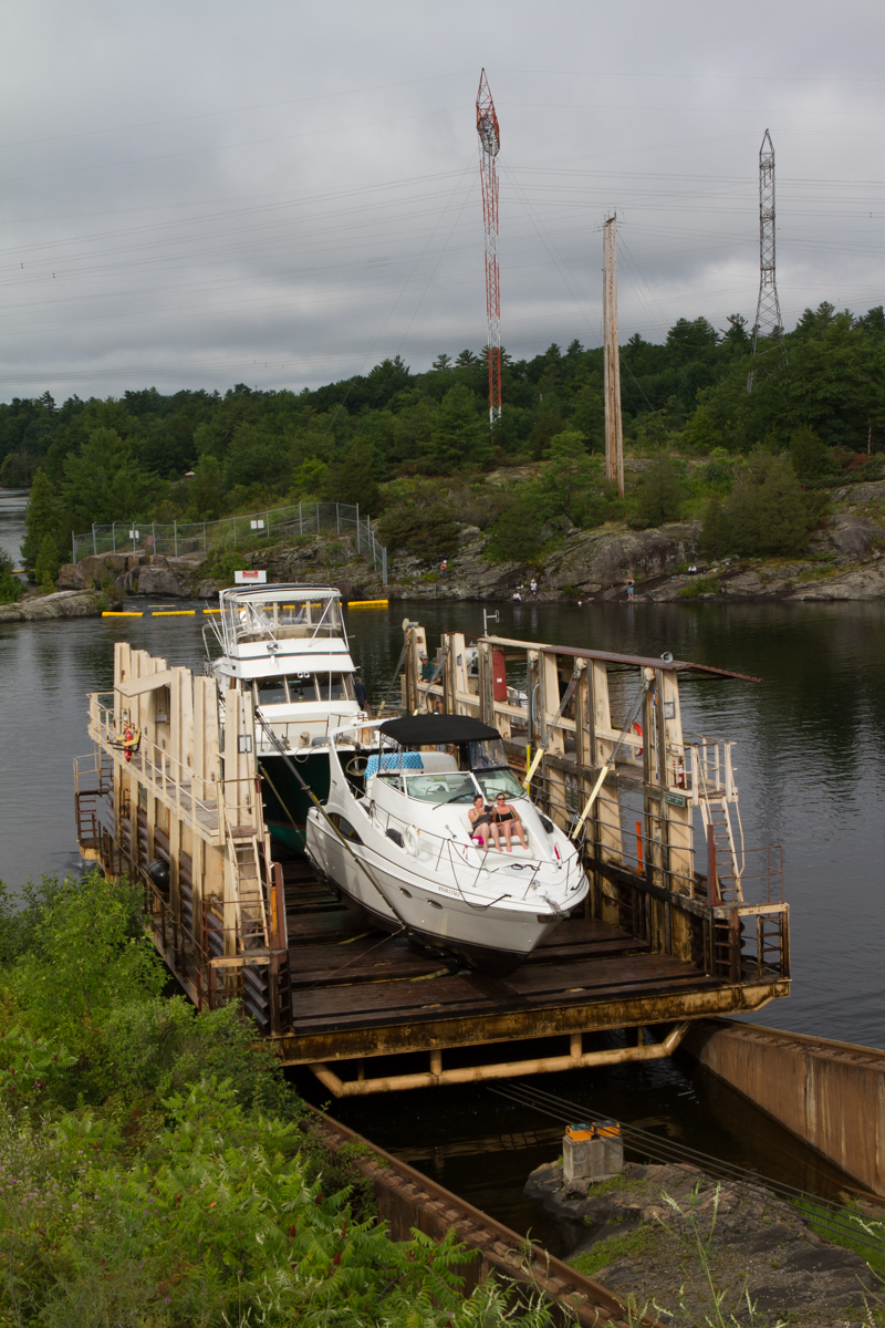 At every lock on the Trent-Severn, there is what is called a “blue line” on the wall. Boats tied up along the blue line are ready to go through the lock and are awaiting a signal from the lockmaster that it is safe to enter. Most of the time a green light appears, but at the Big Chute and the two pan locks at Kirkland and Peterborough boats are called in individually. We moved AfterMath to the blue line at the Big Chute early yesterday, Saturday, in preparation for her transport again over the hill and the road and then back into the water on the other side. This time I wanted to get pictures of AfterMath in the system, so I hopped off when we were called and went up the stairs next to the railway. It was great fun to see how it all looked from shore and, even though I really enjoyed staying on the boat when we were traveling north, I am happy to have the pictures I took on the southbound leg. John picked me up on the other side and we headed on through a couple more locks before stopping for the night.