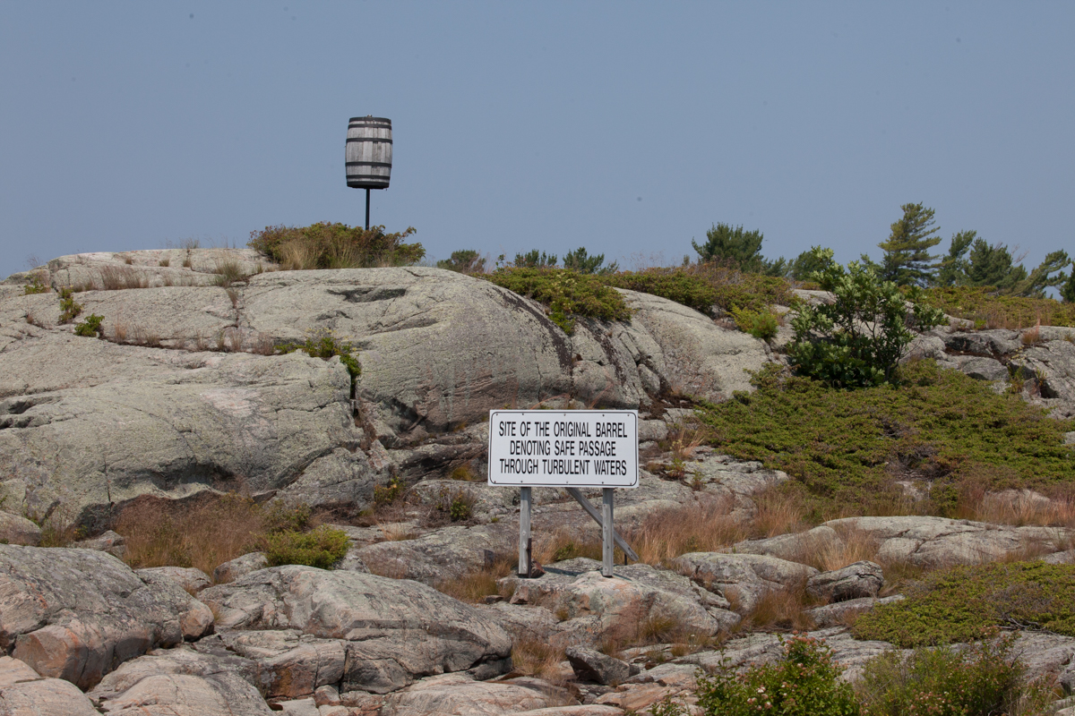 After piloting through the rocks, we had to detour out into the bay again, as one part of the channel has turns that are too short for any boat over 40 feet. The detour brought us back past a lighthouse we passed days ago and past landmarks we have seen before. Apparently, Pointe au Baril is named for the barrel shown here. It marked a treacherous point where a canoe was once lost. The story says that a barrel of whiskey was found the next spring that had fallen from the canoe. Fur traders drank the whiskey and then left the barrel as a beacon to mark the dangerous area. Eventually a torch was placed there for the first returning fishermen to light each day to guide the other boats. The cross is a monument to Samuel Champlain who first came to the Georgian Bay in 1615. He was the first European to map and explore the bay, which was named for King George IV in 1822.