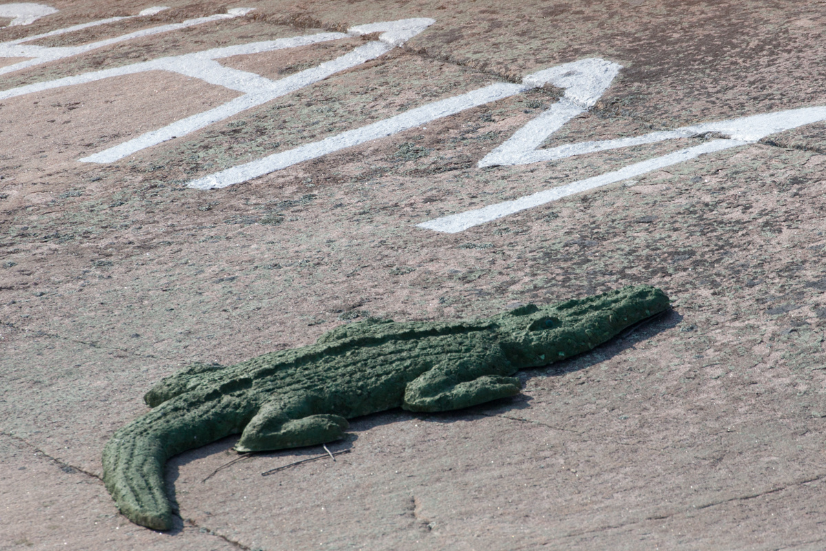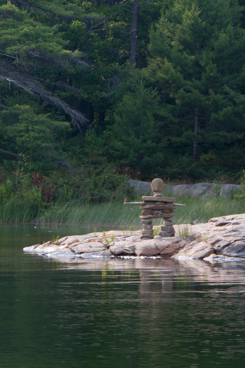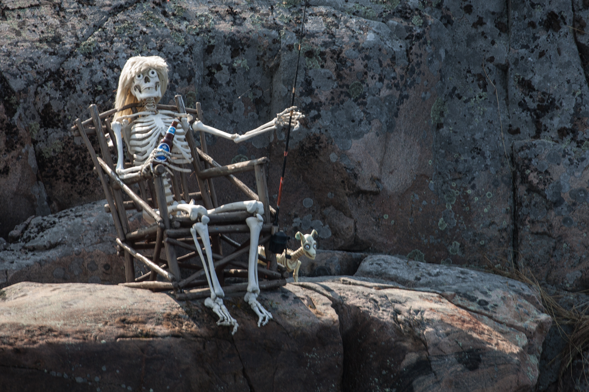Snakelike in curves, one of the especially tricky areas was next to an island that is apparently owned by the Cunninghams. At first I just noticed the big letters painted on the rock, but soon we discovered that the Cunninghams have a sense of humor! It is possible that the only alligator in the Georgian Bay exists on their land, and the blonde fishing skeleton with her dog reminded me that it may take a long time for me to ever catch a fish larger than the one 5 inch one I caught a while ago!