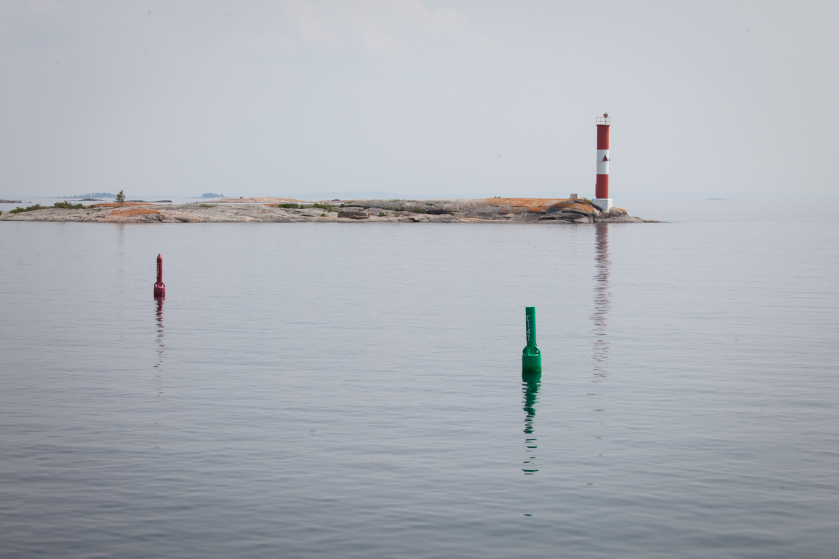 The small boat channel is fascinating. It is a challenge for the helmsman (John), but a joy for the photographer (me)! For much of the trip on Saturday the seascape was dreamlike. If you can imagine the surface of the moon covered with water, but with rocks and craters sticking out in a random pattern with just a little vegetation, you will have an idea of the scene. Besides photographing the channel, I sat far up on the bow to watch for boulders that may not have been charted. John did an amazing job of weaving his way through, sometimes with barely enough room for AfterMath to make the turn between the closely placed red and green buoys that guide the way. Because there are so many intersecting channels on the bay, to make matters worse, it is sometimes hard to remember which side the red or green should be on as it’s difficult to tell if you are returning to or leaving the larger body of water. (Generally, the saying is, “red right returning”, but you have to know if you are coming or going to make that work.) In our case it changed several times a day!