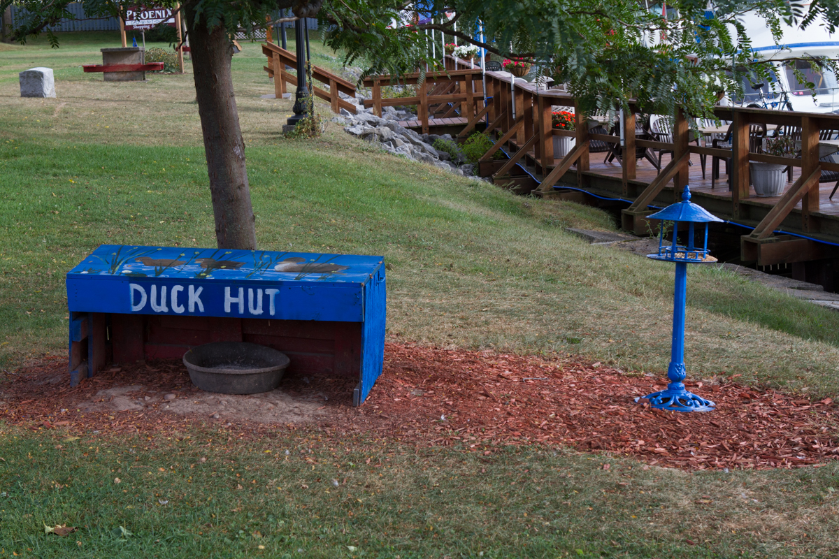 We left Oswego on September 8th and made our way to Phoenix, N.Y. Phoenix is a little town that we passed by on our way west on the Erie and I really wanted to stop there going back. On the weekends, in this town, a group of young teens called the Bridge House Brats gather at the dock. They get boaters food from restaurants, escort them to stores and carry packages, and generally do anything they can for tips. They also work on keeping up the park’s grounds. Although we were not there on the weekend, evidence of these young entrepreneurs is everywhere. The whole area is very eclectic. Duck houses abound, flowers are planted cheerfully around the grounds, there are tables and chairs along the docks and picnic tables on shore, flags of every sort are flying and the whole little park is colorful and charming. We took a walk through the tiny town with a population of about 2800 in the evening and found everything closed up and looking a bit depressed. In the morning, though, all the little cafes and restaurants were open and things seemed much brighter. I found a produce stand with fresh fruits and vegetables and bought, among other things, some wonderfully delicious peaches that seemed to be just picked.