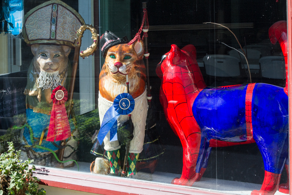 When we were here those months ago, I enjoyed walking around town and seeing all of the beautifully decorated cats that were near the businesses on Main St. I never got to photograph them at the time, so I was excited to have an opportunity to do so on this return trip. However, I saw online that today is the Cat Auction. I hadn’t realized that the cats are all on the street for the summer, but then auctioned off each September for a good cause. Of course I hurried to town to see if I could find them before they were gone for good and, luckily found a few in the store where the auction would be taking place this afternoon. While it wasn’t quite the same as seeing them on Main St., I was happy to get a couple of shots of a few of these statues. I also took some time to photograph other sights along Main St, including a little garden park with beautiful flowers and some friendly bees.