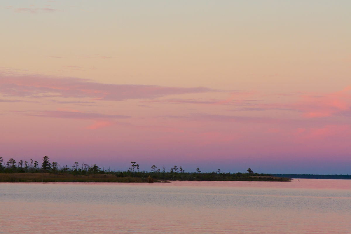 We left our anchorage just north of the Alligator River early on Thursday, November 12 to take advantage of the calmer seas the mornings bring. Up while still dark, I was able to get a few shots of sunrise before we hauled anchor and headed out. We arrived in the Pungo Canal in the early afternoon and at sunset we were treated to a spectacle of nature that will long be remembered. The sky changed from gold to orange to deep red and purple over about one half hour’s time bringing an end to a beautiful day on the water.