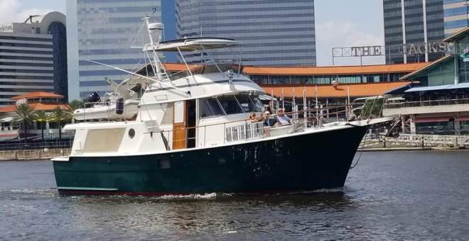 Thanks here go to Scott, the assistant dock master in Jacksonville at the stadium marina. He is a client of Kelly’s and he saw us passing by while out in the marina’s boat. Scott snapped this great picture of us near the Jacksonville Landing and sent it to Kelly who then forwarded it to us. We love this shot!