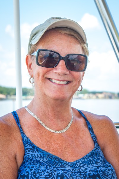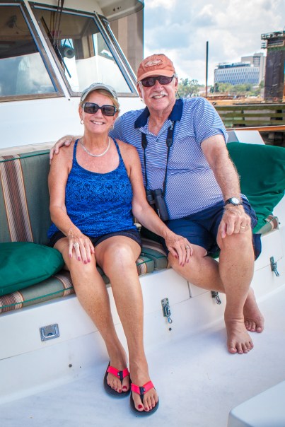 Before we took the boat to Lamb’s we made sure they knew that we had a firm date with our dear friends, Becky and Judd from August 10th to the 13th. Becky and Judd made plans a few months ago to come visit us aboard, and we were not about to lose that chance just because of maintenance work. Although they had visited us when we were in Grenada, we were not able to take AfterMath out of the marina at the time. The slips were so tight and it just wasn’t a possibility for us. We wanted them to be able to be underway with us and had thought we would be in Brunswick when they arrived, so we planned a trip to Jekyll Island and Cumberland Island. Unfortunately, scheduling our maintenance wasn’t as easy as we hoped for, so, as always, we had to be flexible. Instead of the Golden Isles of Georgia, we decided we would take a trip a little way down the St. John’s River with Becky and Judd. They arrived Saturday, August 10th, and although we originally planned to leave that day, because of the heat, we decided to leave Sunday morning. We had a wonderful trip to Doctors Lake, had a fun dinghy ride around the area, and planned on dinner on shore at Whitey’s Fish Camp. Once again, we had to be flexible with our plans. As we watched from the boat, thunder and lightning storms rolled in along with winds and white caps. So, instead of going ashore, we grilled steaks and had a fun dinner aboard. Again because of the heat, we decided to return to Lamb’s on Monday after a ride around Jacksonville on the boat. It was a perfect day to take a ride, and after our return, we again chose to just enjoy each other’s company while we ate aboard.